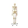 Crafted from specialized plastic and meticulously modeled after a natural specimen, this model showcases the entire human skeletal system. The mandible of the model is articulated, allowing it to open and close. Important muscle origins (highlighted in red) and insertions (highlighted in blue) are color-coded on the right side of the model. On the left side, the bones are labeled with numbers for easy identification. This model effectively illustrates the natural functions of the joints. The model is mounted on a wheeled base.