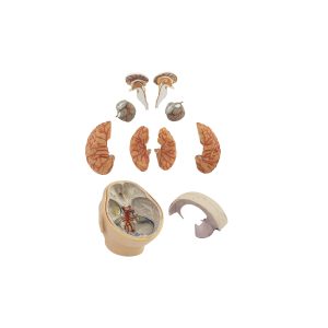 This life-sized model is crafted from specialized plastic. It consists of a total of 10 components, including an 8-piece brain, dura mater, 12 cranial nerves, and the basilar artery. It provides a detailed representation of dura mater structures, including the dural sinus, falx cerebri, and tentorium cerebelli. It is mounted on a base.