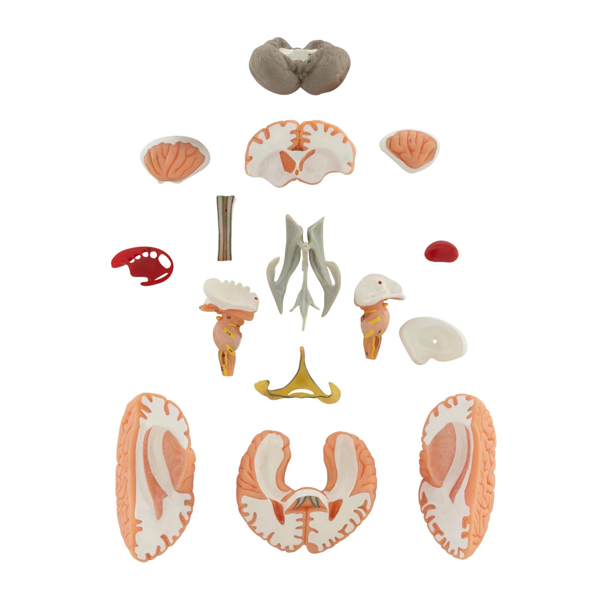 This life-sized model is crafted from specialized plastic. It can be disassembled into 15 parts, including cerebral hemispheres (2 pcs), temporal and occipital lobes with the limbic system, cerebellum, frontal lobe, brain stem (2 pcs), corpus callosum, corpus striatum, insula (2 pcs), left lentiform nucleus, right internal capsule, brain ventricles. It is mounted on a base.