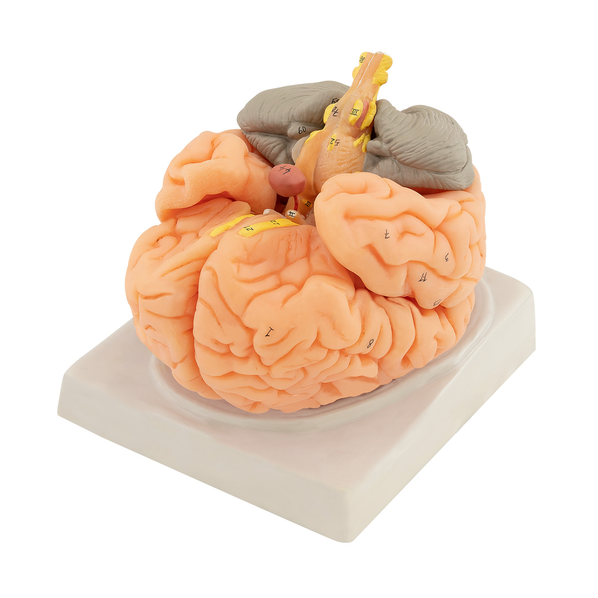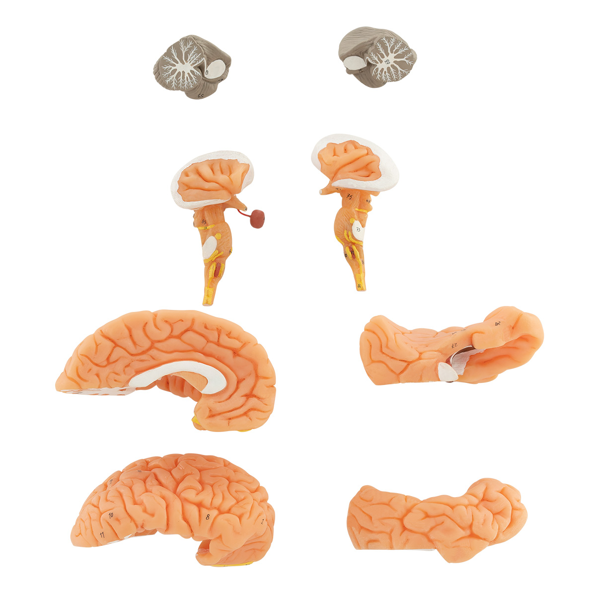 This life-sized model is crafted from specialized plastic. It can be disassembled into 8 parts, including frontal and parietal lobes (2 pcs), temporal and occipital lobes (2 pcs), medulla (2 pcs), and cerebellum (2 pcs). The model is mounted on a base.