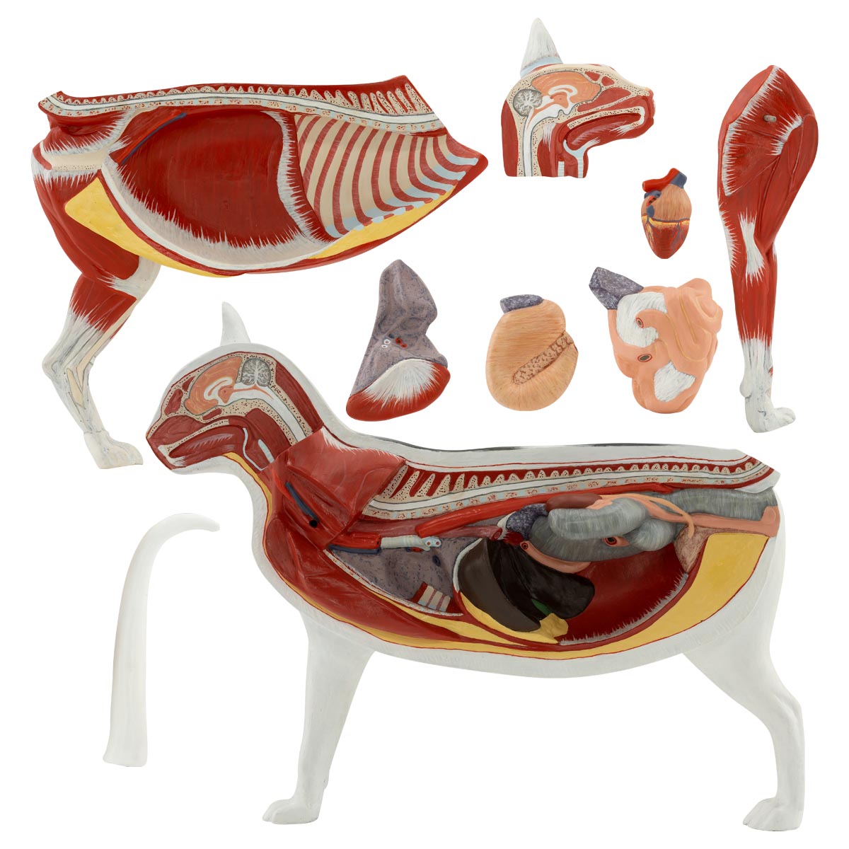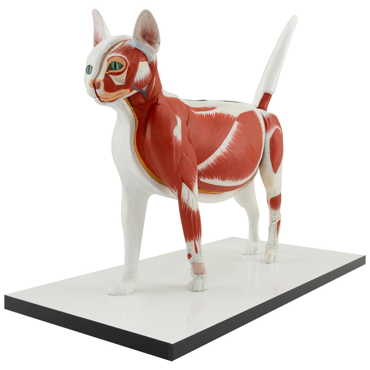 This model is crafted from specialized plastic and is in its natural size. The model’s right side shows a cat’s textured fur, while the left side shows the muscular system. The model’s head can be split along the centerline. The lungs, heart, stomach, intestines, tail, and left front leg can be detached. It consists of 9 parts in total. It is mounted on a base.