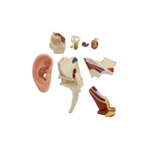 Made from special plastic, this model is 4 times larger than its natural size. It can be disassembled into 8 parts including auricle, temporal bone (3 pcs), eardrum together with malleus and incus, Eustachian tube, and labyrinth (2 pcs). The model is mounted on a base.