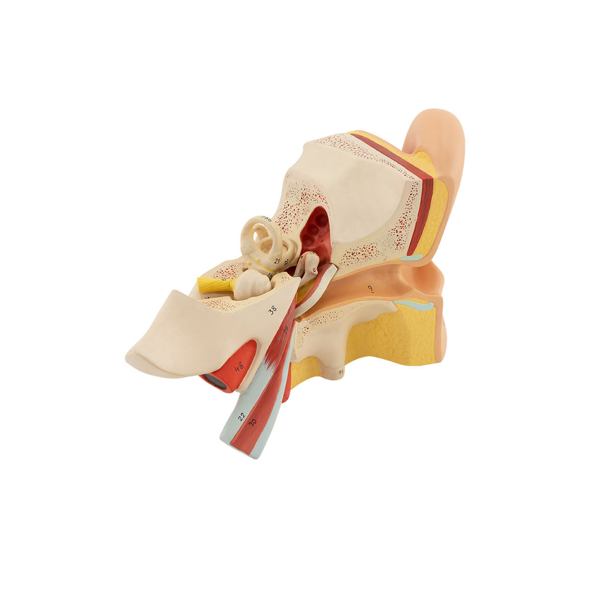 Made from special plastic, this model is enlarged to approximately 3 times its natural size and can be disassembled into 6 parts. Detachable components include the petrous part of the temporal bone, the anterior wall of the external auditory meatus, the eardrum with the malleus, and the incus. Additionally, the bony labyrinth can be taken apart to reveal its interior. The model is mounted on a base.