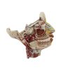 This life-sized model, crafted from specialized plastic separates into 2 parts. The model demonstrates nerves, blood vessels, muscles, especially the trigeminal nerve and facial nerve structures, and the tongue can be removed. The model also displays arteria auricularis posterior, nervus laryngeus superior, ramus internus, nervus laryngeus superior, ramus externus, and nervus infraorbitalis. The model is mounted on a base.