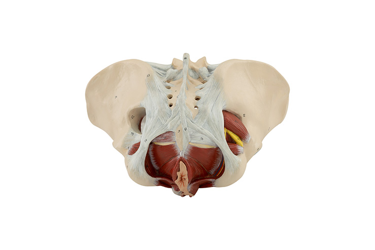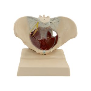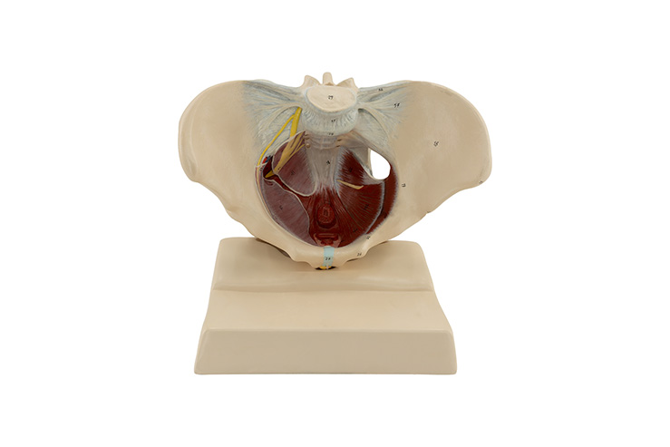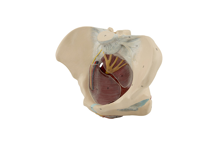 The model, crafted from specialized plastic, is life-sized. The model is in one piece and shows the pelvic muscles and nerves. It stands on a removable base.