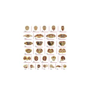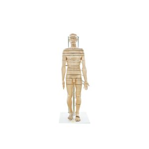 This life-sized model is crafted from specialized plastic. The model consists of a total of 32 parts, forming horizontal (axial) sections. These sections are designed to represent a top-down view of the anatomical structures. Starting from the head, the sections pass through the brain, neck, chest, abdomen, pelvis, left lower extremity (thigh, leg, and foot), and left upper extremity (arm, forearm, hand, and second finger). Each articulated part of the model is detachable and can be reattached as desired. The model is securely mounted on a wheeled steel base.