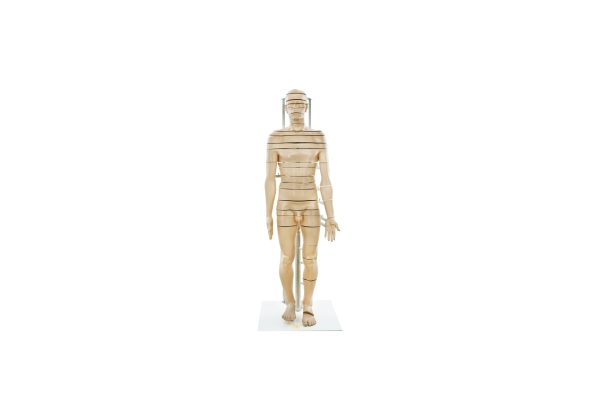 This life-sized model is crafted from specialized plastic. The model consists of a total of 32 parts, forming horizontal (axial) sections. These sections are designed to represent a top-down view of the anatomical structures. Starting from the head, the sections pass through the brain, neck, chest, abdomen, pelvis, left lower extremity (thigh, leg, and foot), and left upper extremity (arm, forearm, hand, and second finger). Each articulated part of the model is detachable and can be reattached as desired. The model is securely mounted on a wheeled steel base.
