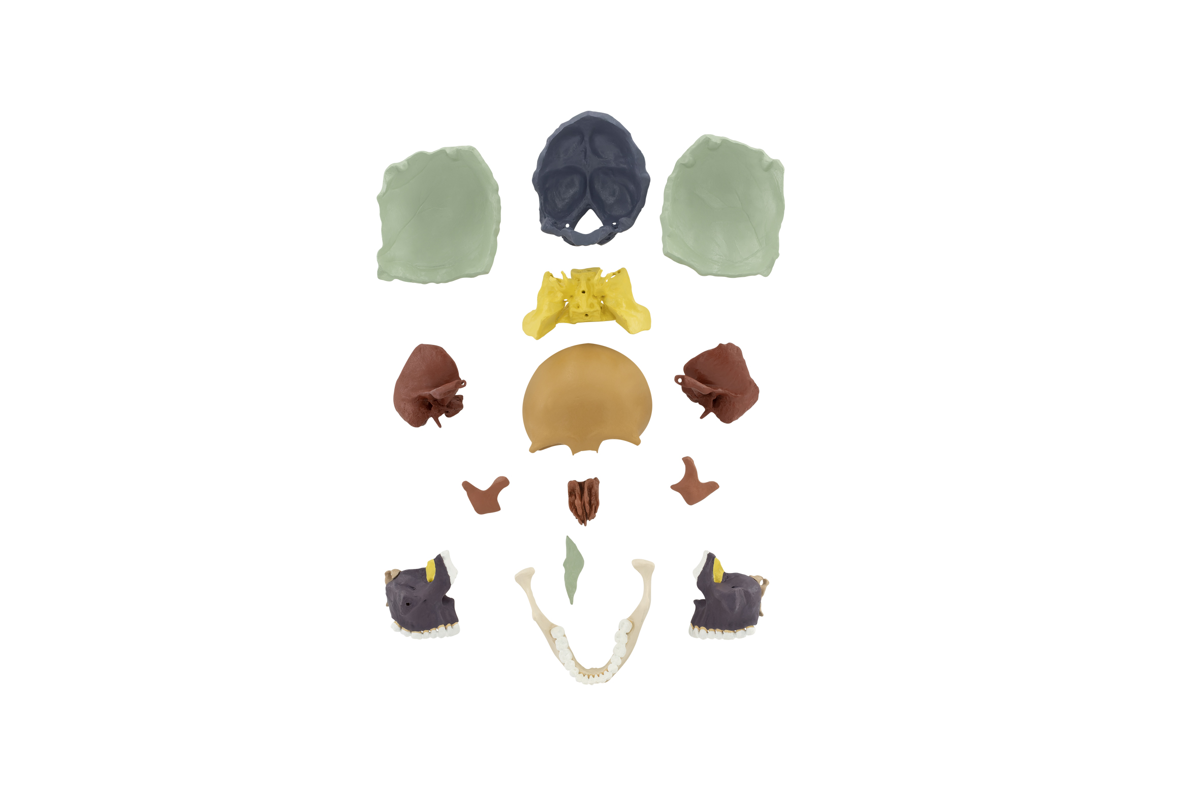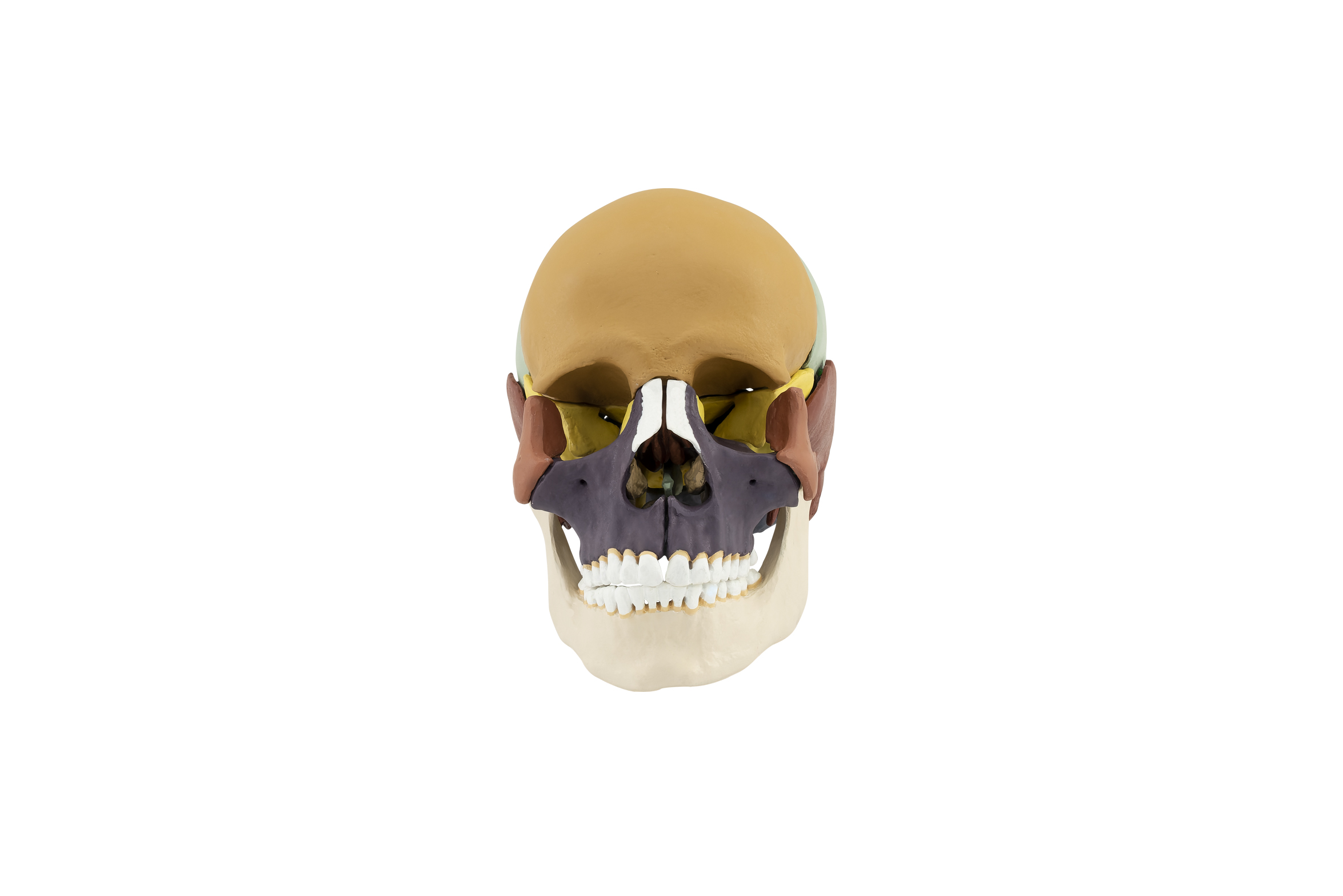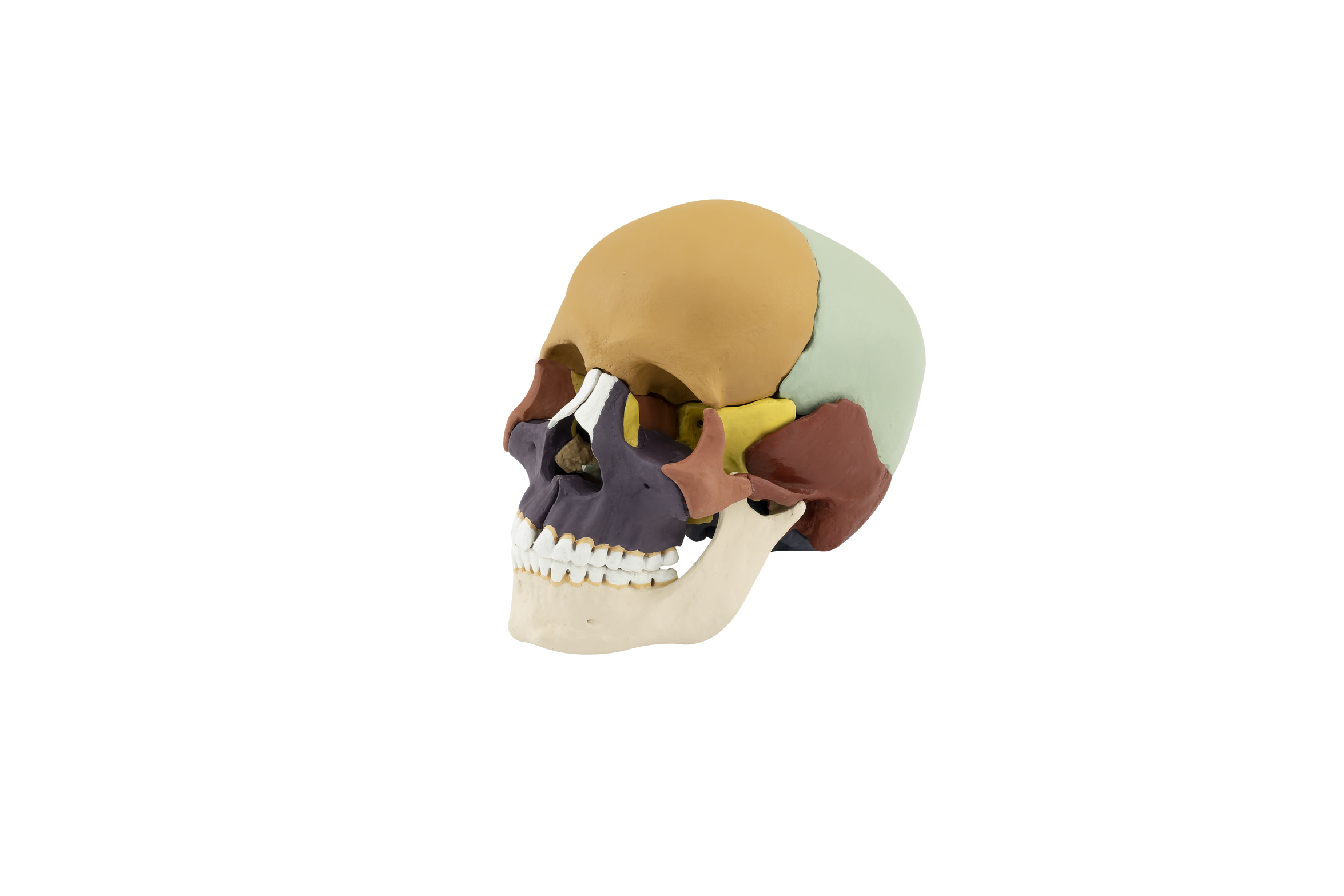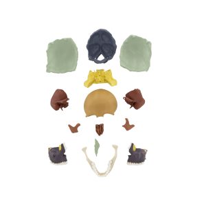 The model is made of specially developed plastic and modeled based on a natural specimen. The bones in the model are colored to facilitate learning and can be easily disassembled and reassembled. It consists of 14 parts. The sphenoid bone, occipital bone, and the two temporal bones form the basis of the skull. The parietal bones and the frontal bone attach to the anterior of the sphenoid bone. The facial part of the skull is then completed through the attachment of the right and left maxilla, each of which also includes the lacrimal, nasal, and palatine bones. Facial and cranial bones (viscerocranium and neurocranium) are connected to each other by the zygomatic bone. The zygomatic bone can be individually removed. The mandibula is fixed into sockets on either side of the skull through a hinge joint.