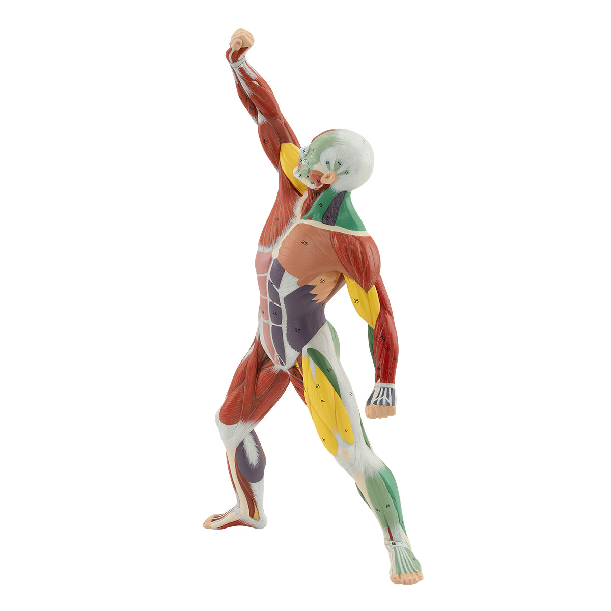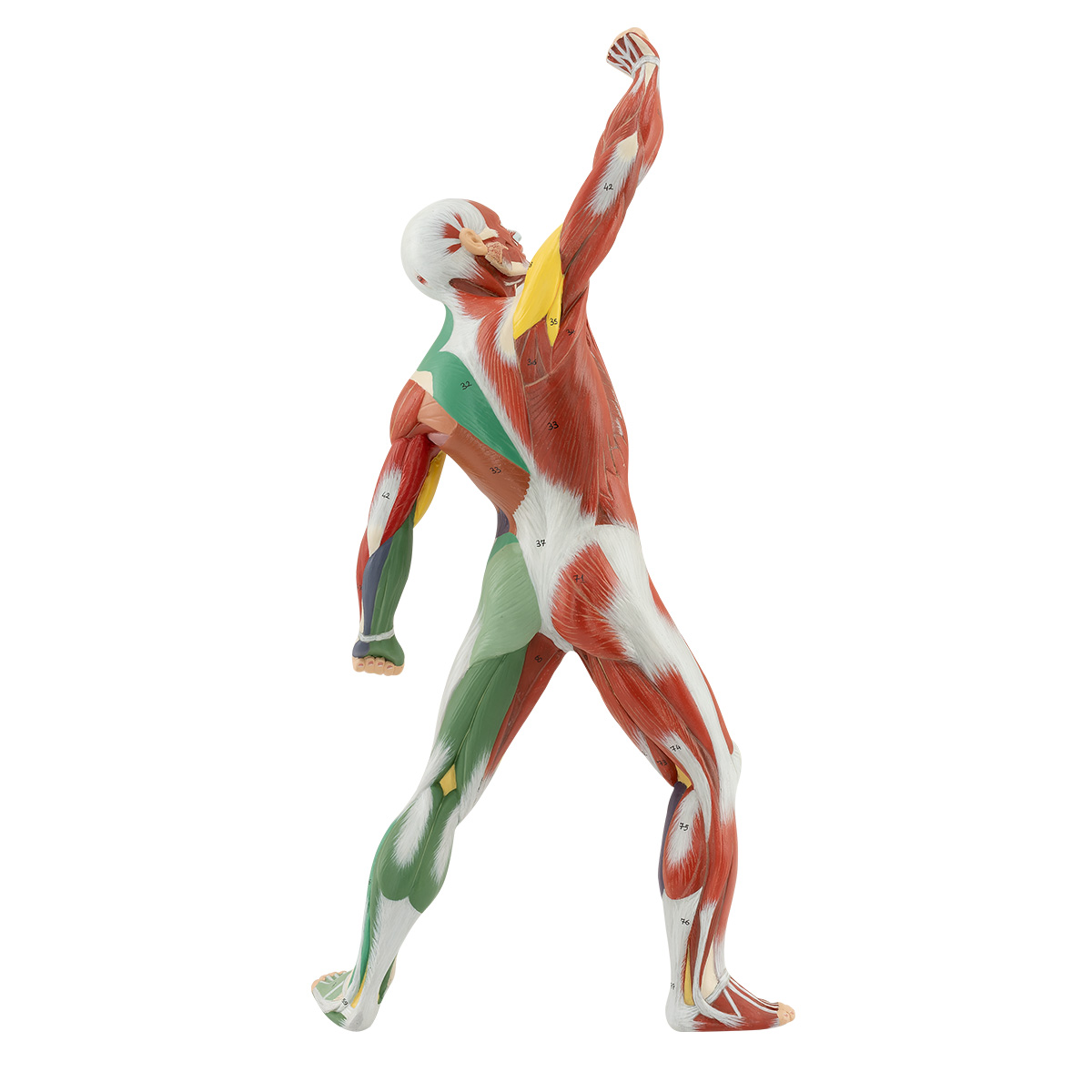 This model is crafted from specialized plastic and is scaled to ¼ of life-size. It shows the muscles in topographical detail, with superficial muscles shown and color-coded according to their innervation groups for easy distinction. It is a single-piece design mounted on a removable base.