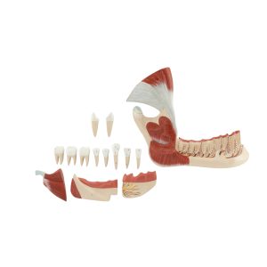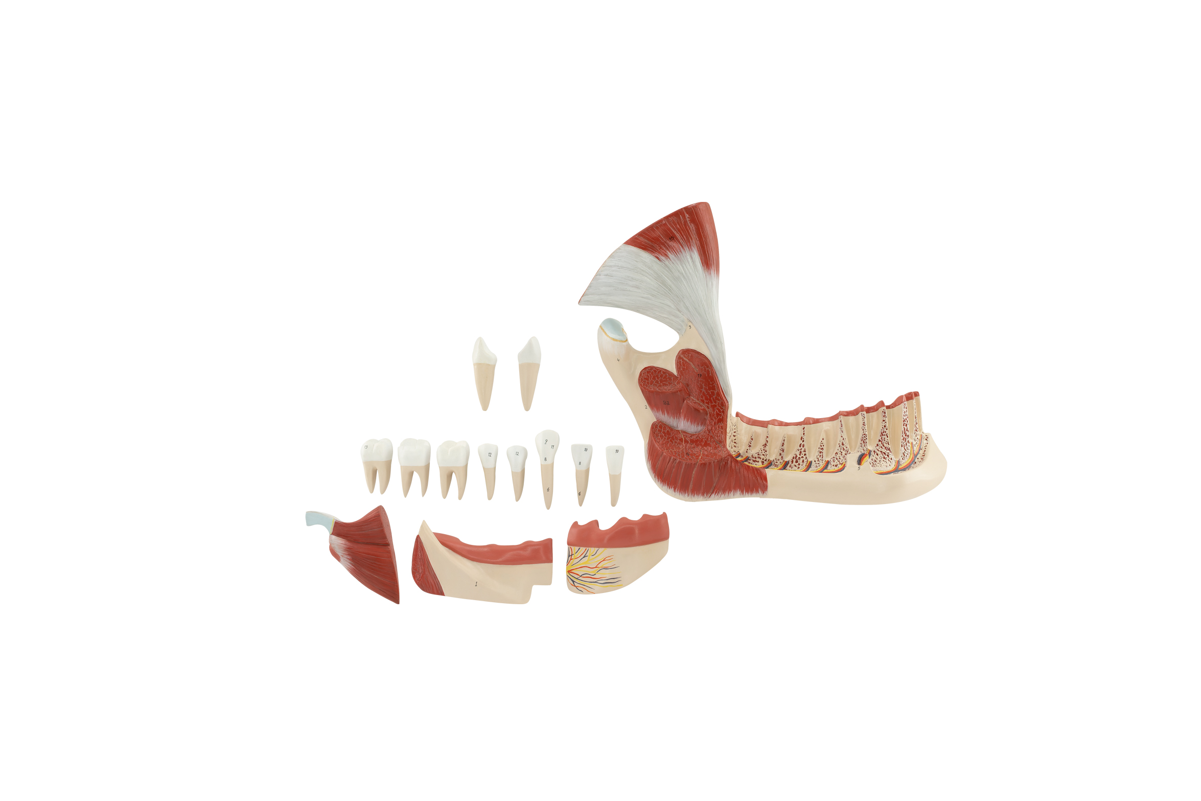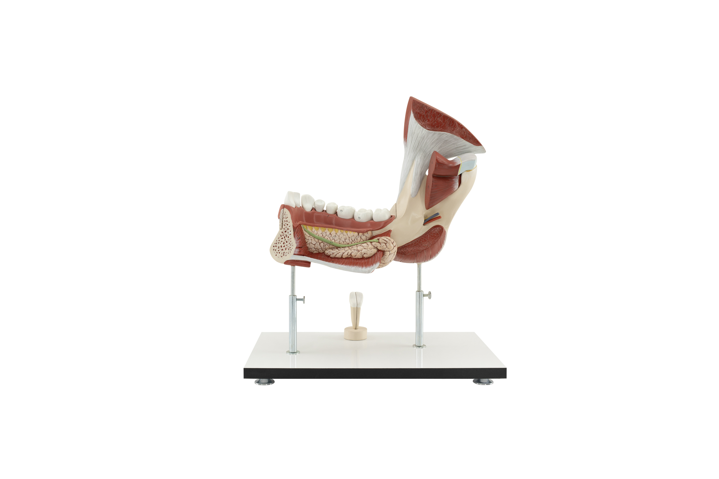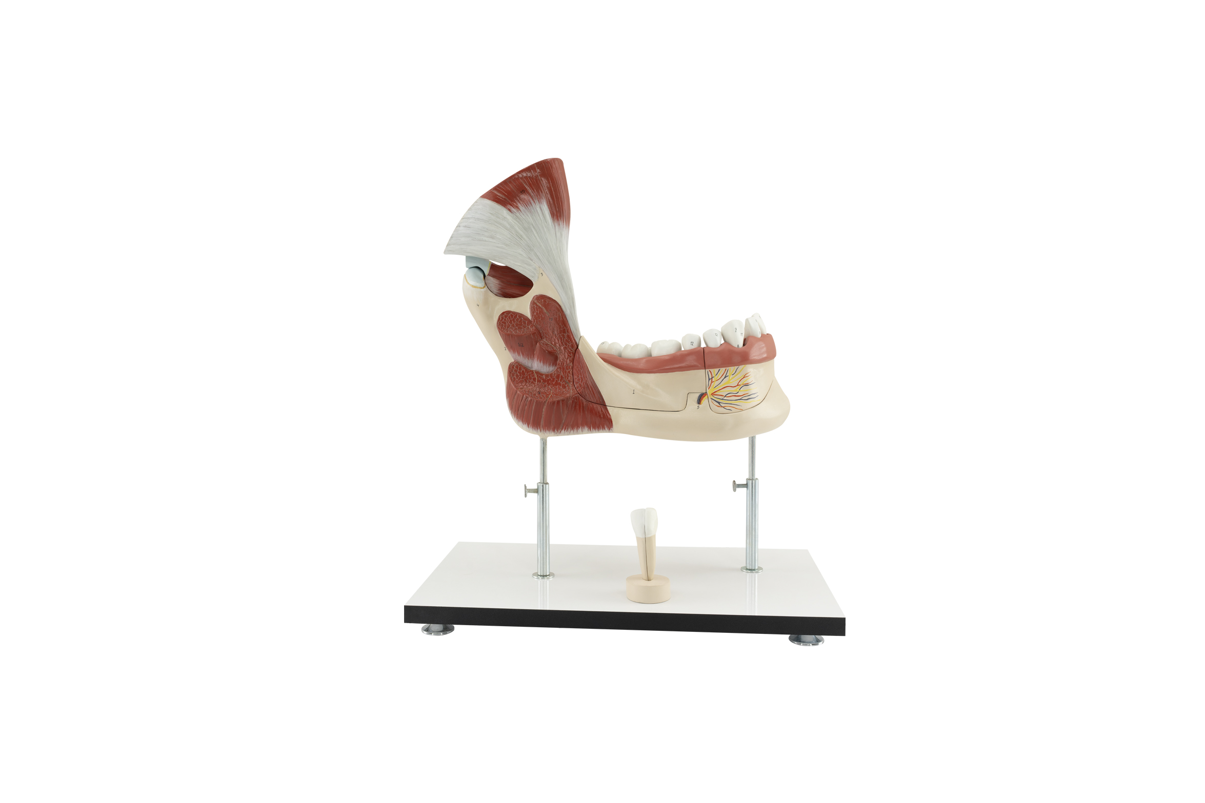 This model made from special plastic is enlarged approximately 3 times its natural size. It can be disassembled into 14 parts. The model shows the temporomandibular joint. It is mounted on a base.